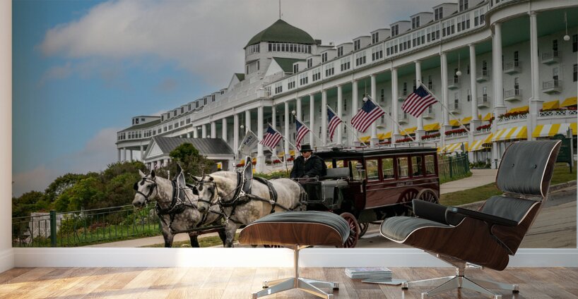 The Grand Hotel on Mackinac Island, Michigan. One of the Hotel's stately carriages passing the hotel as it travels into town .