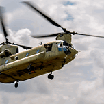 The crew of a Boeing CH-47 Chinook wave as they depart the airfield.