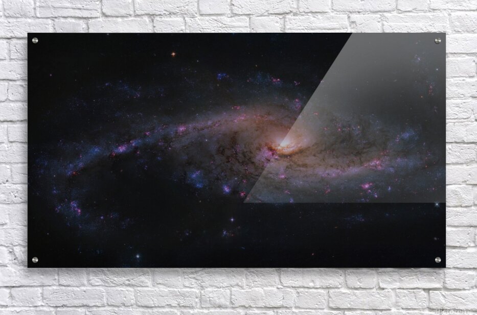 Discover the explosive beauty of NGC 4536, a magnificent intermediate spiral galaxy undergoing a dramatic starburst phase, where new stars are igniting at an extraordinary rate. Located approximately 50 million light-years away in the constellation Virgo, this barred spiral showcases sweeping, loosely wound arms adorned with brilliant blue clusters of hot young stars, vivid pink-red regions of glowing hydrogen gas, and intricate dark dust lanes that weave through the structure like cosmic threads. Captured in exquisite detail from high-resolution astrophotography, this print highlights the galaxy's dynamic energy: a bright central core surrounded by chaotic yet elegant arms filled with stellar nurseries, making it a true spectacle of galactic evolution and renewal. This artwork brings the raw power and vibrancy of deep space into your home or office. Ideal for astronomy enthusiasts, science lovers, or anyone seeking inspiring modern wall decor that sparks conversation and wonder. Expertly processed from public domain NASA Hubble telemetry data for stunning clarity and color