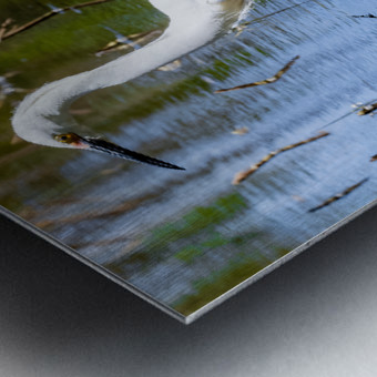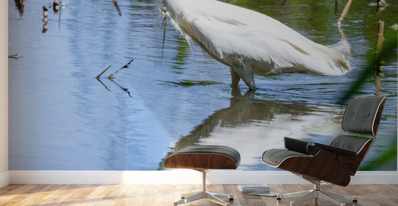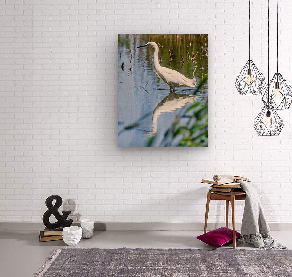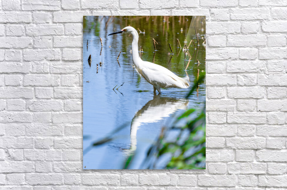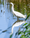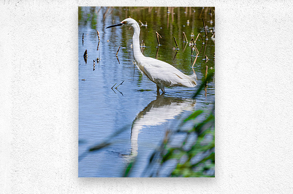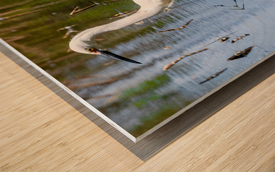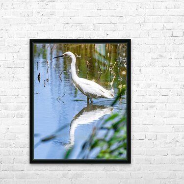 ABOUT THIS ARTWORK: SNOWY EGRET WADING NEAR THE SHORELINE OF A LAKE