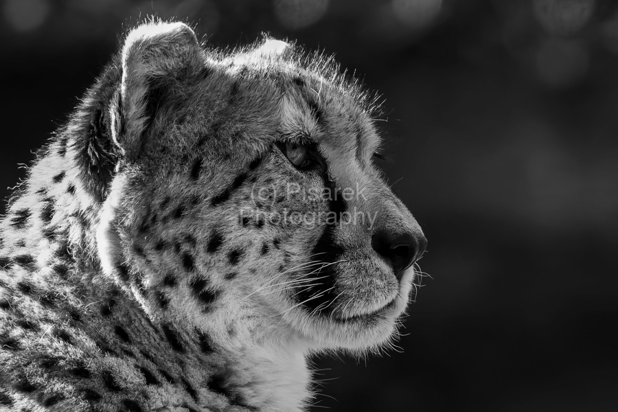 A close-up monochrome photograph captures the detailed profile of a cheetah, showcasing its distinct spotted fur and intense gaze. The blurred background contrasts with the sharpness of the cheetah's features, highlighting its natural elegance and grace.