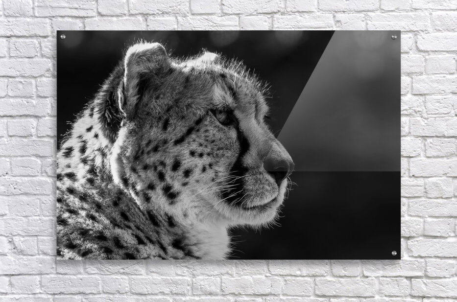 A close-up monochrome photograph captures the detailed profile of a cheetah, showcasing its distinct spotted fur and intense gaze. The blurred backgro...[+]