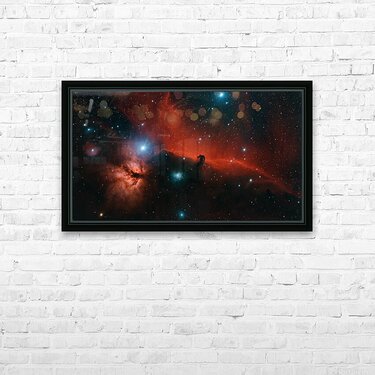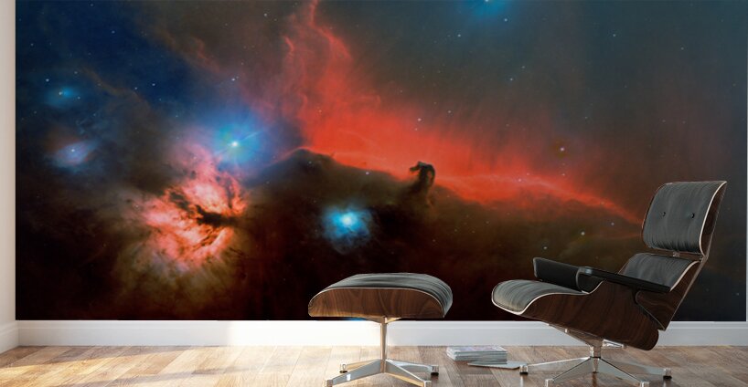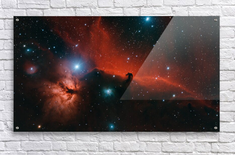 Dive into one of the most iconic and dramatic scenes in the night sky: the legendary Horsehead Nebula (Barnard 33), a striking dark silhouette carved from cosmic dust and gas, dramatically etched against the glowing red emission nebula IC 434. In this captivating astrophoto, the Horsehead's unmistakable equine profile stands proud atop a turbulent ridge of bright hydrogen gas, illuminated by the fierce ultraviolet radiation from nearby hot stars—including Alnitak in Orion's Belt. Vivid crimson emission clouds billow like flames across the frame, contrasted by deep indigo and teal pockets of oxygen-rich gas, while scattered blue reflection nebulae shimmer like distant sapphires amid the swirling interstellar medium. Located in the constellation Orion, approximately 1,300 light-years from Earth, IC 434 is a vast H II region—an active star-forming zone—spanning tens of light-years in reality, though the Horsehead dark nebula itself measures roughly 3.5 light-years tall by 2.5 light-years wide. This masterpiece captures not just the famous dark horse's head but the broader fiery landscape, including hints of the nearby Flame Nebula (NGC 2024), all rendered in exquisite detail through dedicated long-exposure imaging from dark skies. The rich, painterly palette—deep midnight blues and electric cyan accents against blazing reds and oranges—creates a sense of depth and motion that feels almost alive, as if you're peering through a window into the birthplace of stars. The intricate tendrils of glowing gas and the subtle gradations in the dust clouds make this image a standout for any space enthusiast or art collector who appreciates the sublime beauty of the universe.