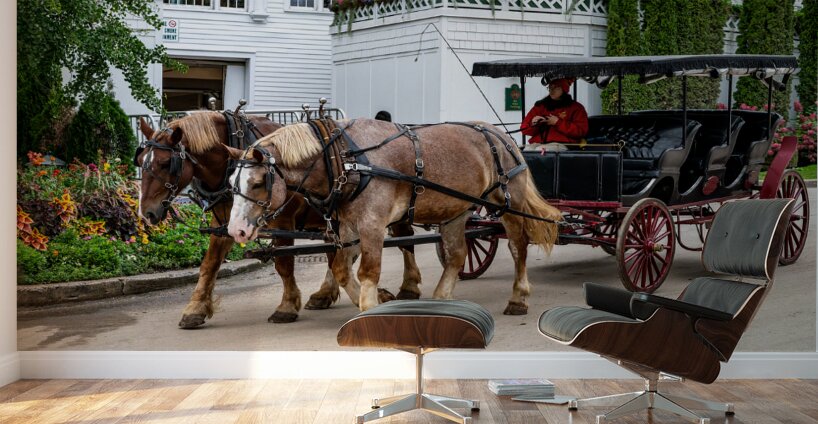 A pair of horses full a carriage past The Grand Hotel on Mackinac Island, Michigan.