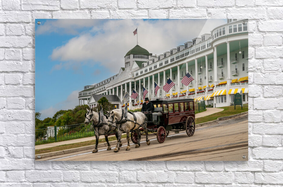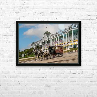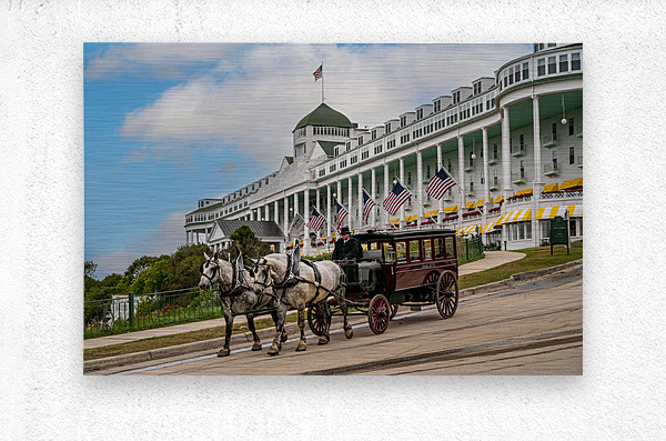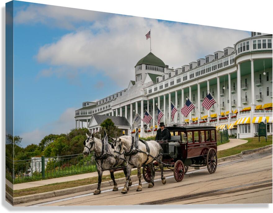 The Grand Hotel on Mackinac Island, Michigan. One of the Hotel's stately carriages passing the hotel as it travels into town .