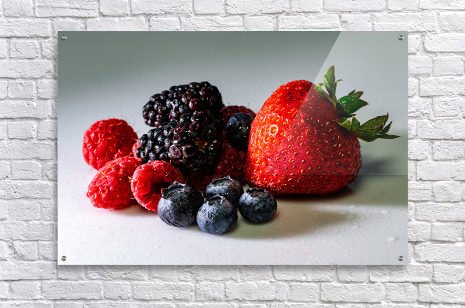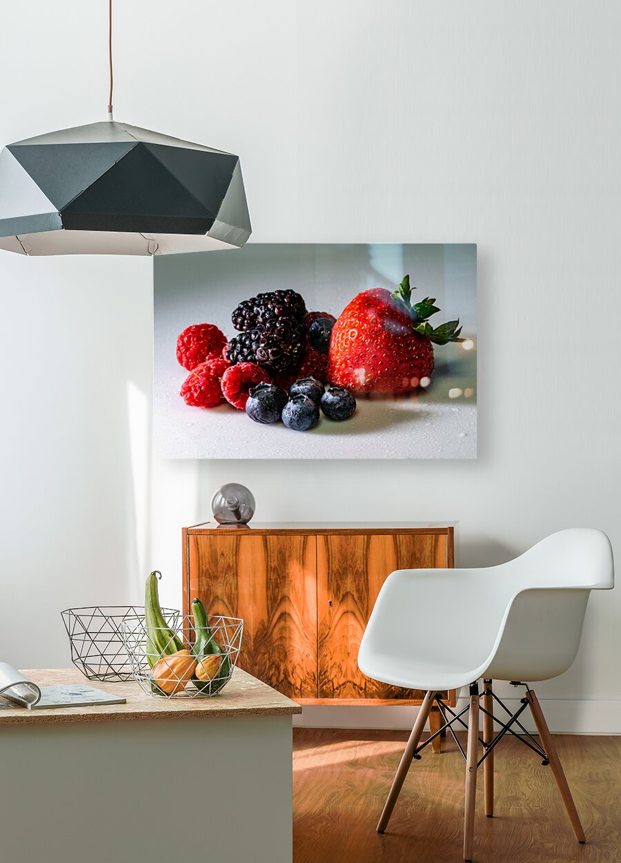 Indulge in the rich colors and intricate details of nature with this stunning macro photograph, featuring a vibrant medley of strawberries, blackberries, raspberries, and blueberries, each glistening with delicate water droplets. The high-resolution image captures the luscious textures and deep, natural hues of these fresh berries, making it a perfect piece for food lovers, kitchen décor, or anyone who appreciates the beauty of nature up close. Printed on high-quality materials with exceptional color accuracy, this print brings a refreshing, mouthwatering appeal to any space. Whether displayed in a dining area, café, or modern kitchen, it adds a touch of freshness and vitality to your surroundings.