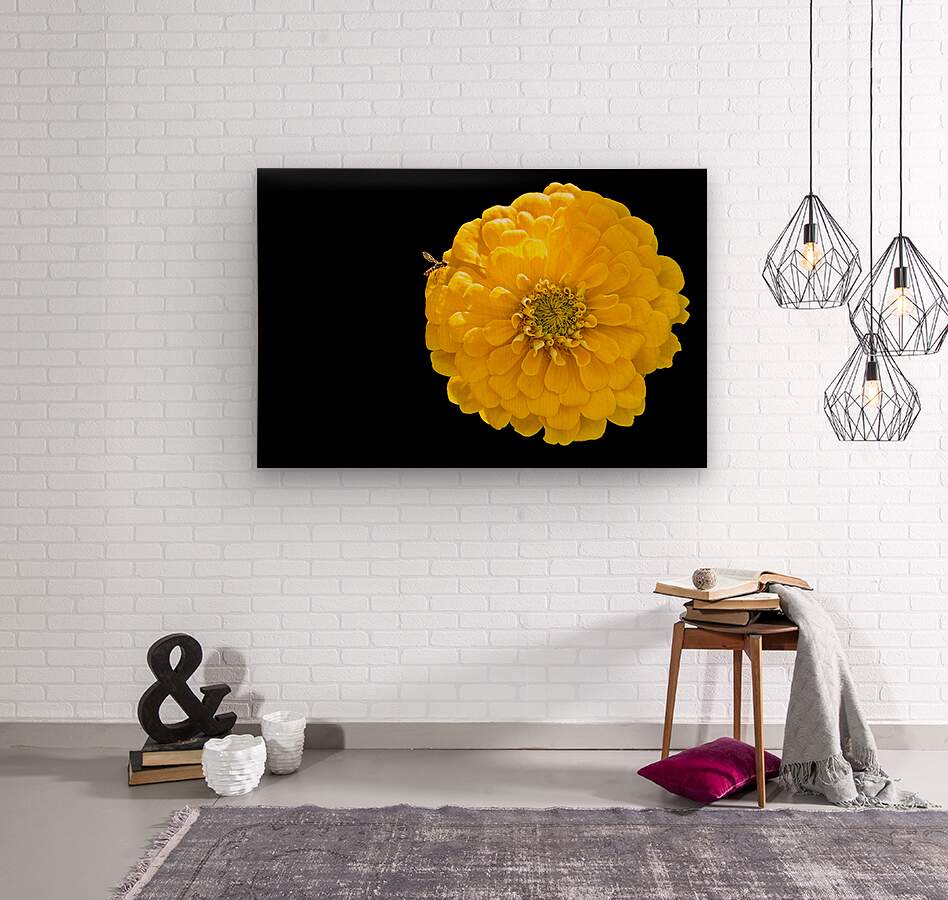 ABOUT THIS ARTWORK: YELLOW ZINNIA AND A HOVERFLY