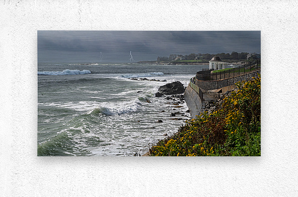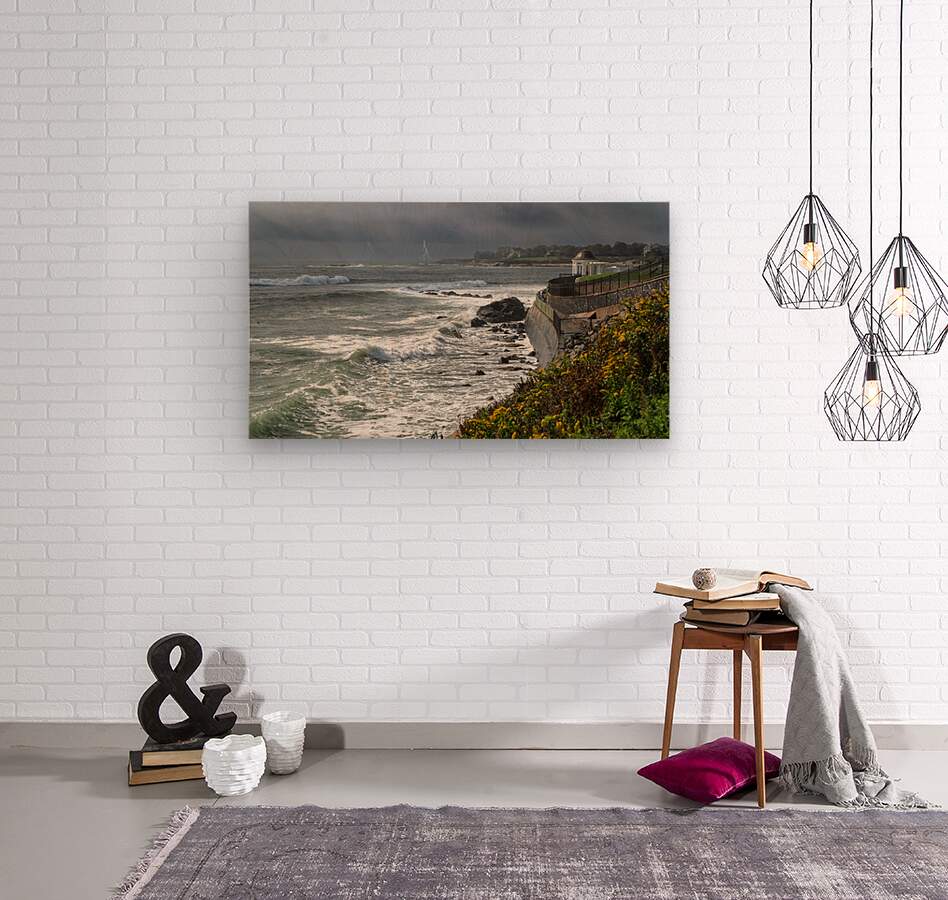 A storm is approaching Newport, Rhode Island as people take a last few oceanside pictures before running for cover.
