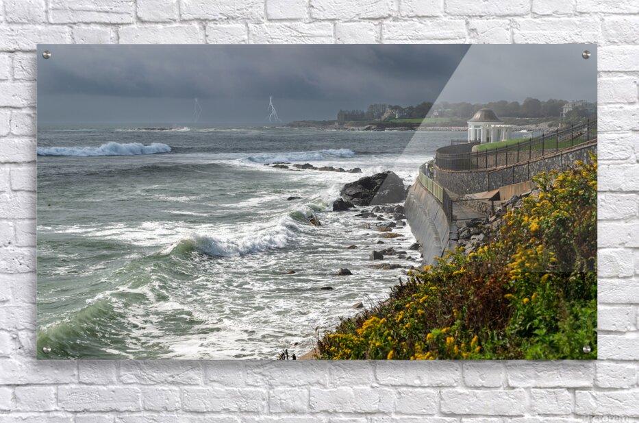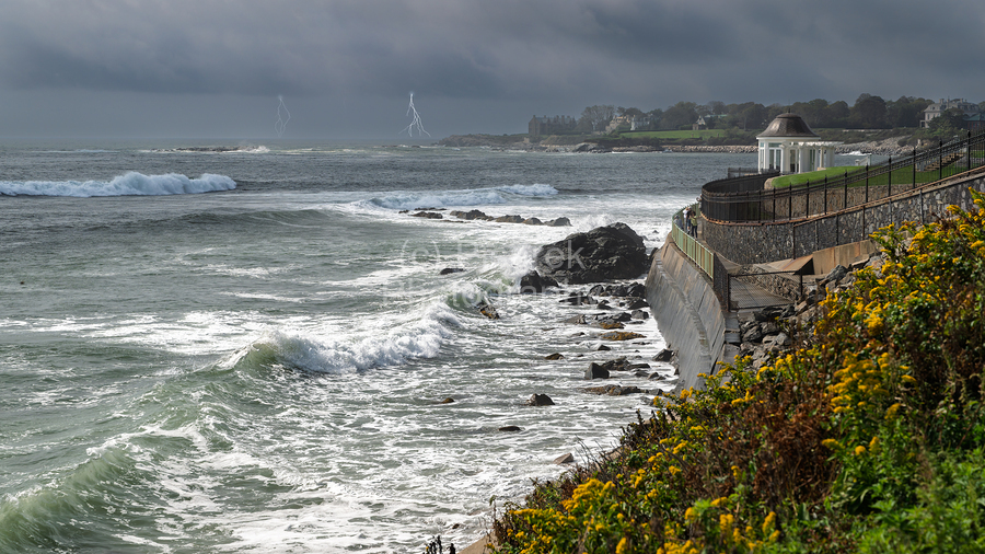 A storm is approaching Newport, Rhode Island as people take a last few oceanside pictures before running for cover.