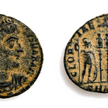 A mid second century Roman bronze coin, minted by the authorities of Klaros, the famous oracle sanctuary of Apollo Klarions. The obverse is a portrait of Antoninus Pius (Emperor from 138 to 161AD) with his title "“Emperor Caesar T. Aelius Hadrianus Antoninus Augustus”. The reverse shows Apollo and Artemis standing on either side of the Delphic tripod.