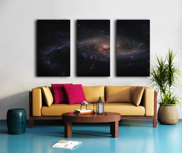 Discover the explosive beauty of NGC 4536, a magnificent intermediate spiral galaxy undergoing a dramatic starburst phase, where new stars are igniting at an extraordinary rate. Located approximately 50 million light-years away in the constellation Virgo, this barred spiral showcases sweeping, loosely wound arms adorned with brilliant blue clusters of hot young stars, vivid pink-red regions of glowing hydrogen gas, and intricate dark dust lanes that weave through the structure like cosmic threads. Captured in exquisite detail from high-resolution astrophotography, this print highlights the galaxy's dynamic energy: a bright central core surrounded by chaotic yet elegant arms filled with stellar nurseries, making it a true spectacle of galactic evolution and renewal. This artwork brings the raw power and vibrancy of deep space into your home or office. Ideal for astronomy enthusiasts, science lovers, or anyone seeking inspiring modern wall decor that sparks conversation and wonder. Expertly processed from public domain NASA Hubble telemetry data for stunning clarity and color
