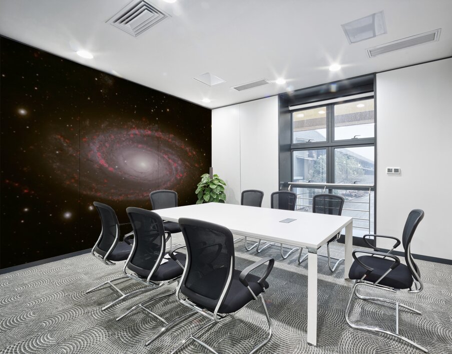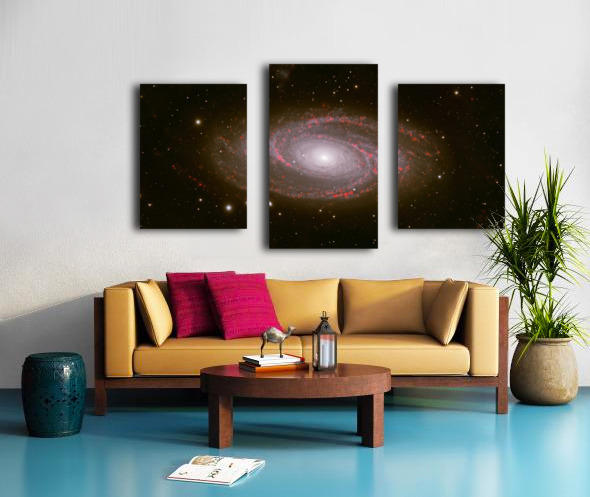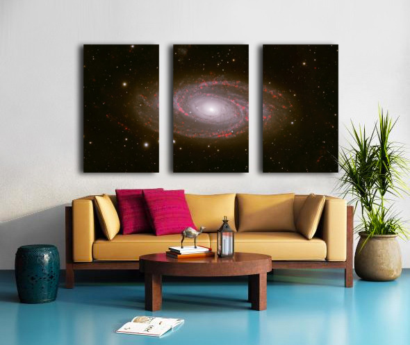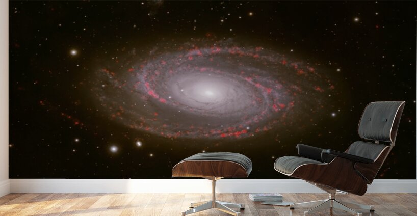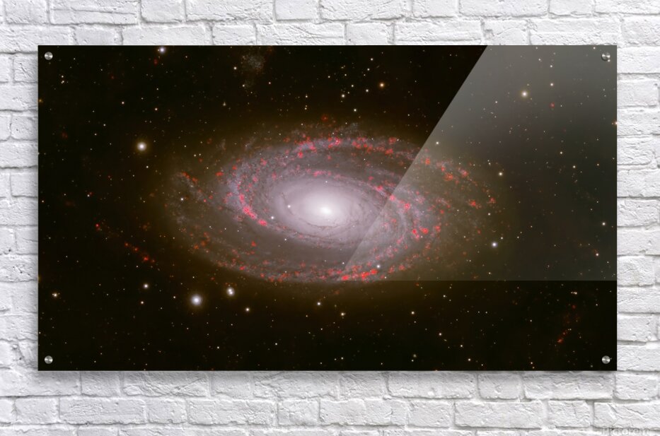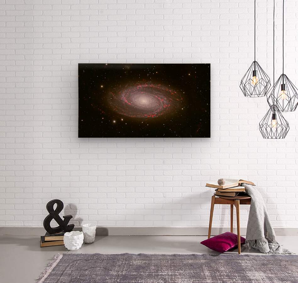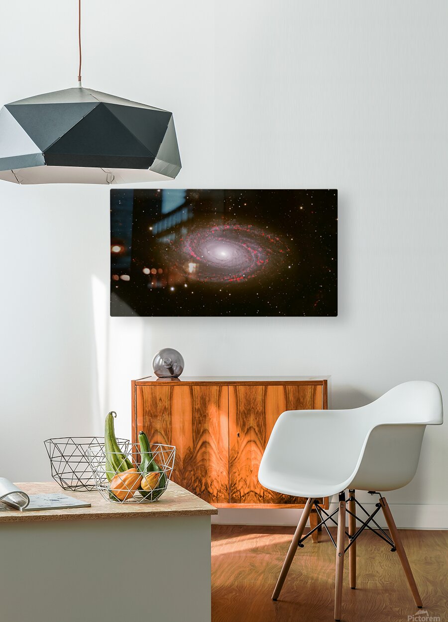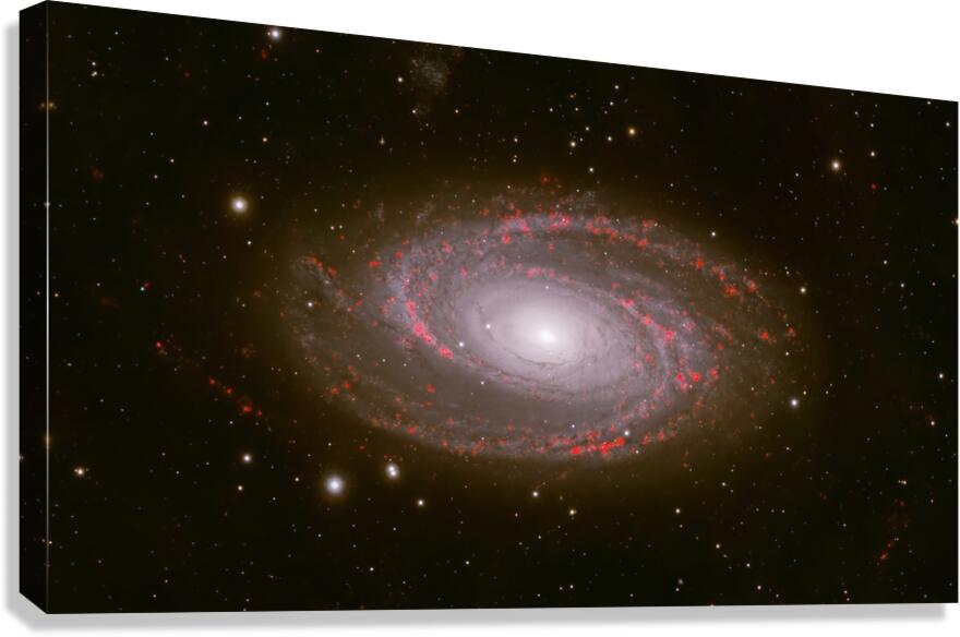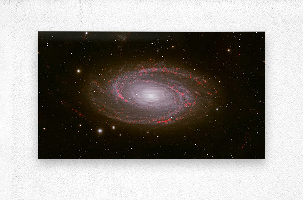 Behold the breathtaking grandeur of Messier 81, one of the most iconic grand-design spiral galaxies in the northern sky. Captured with exquisite detail, this deep-sky masterpiece reveals the galaxy's luminous core glowing like a cosmic beacon, surrounded by elegantly winding spiral arms alive with vibrant red star-forming regions—glowing H-alpha emission nebulae where new stars are born in brilliant scarlet bursts. Spanning nearly 100,000 light-years and located about 12 million light-years away in the constellation Ursa Major, M81 (also known as Bode's Galaxy) showcases symmetrical beauty rarely seen with such clarity. The artist's masterful use of narrowband imaging highlights the intricate dance of gas, dust, and young stars, transforming this distant island universe into a vivid, almost painterly scene of celestial creation. Edition: Limited to 25 signed and numbered worldwide Authenticity: Includes certificate of authenticity Perfect for: Astronomy enthusiasts, modern home décor, science-inspired offices, or as a thoughtful gift for stargazers
