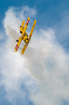 Renowned aerobatic pilot Jerry Wells commands his vibrant yellow Bücker Bü 133 Jungmeister through a flawless maneuver, trailing dramatic white smok...[+]