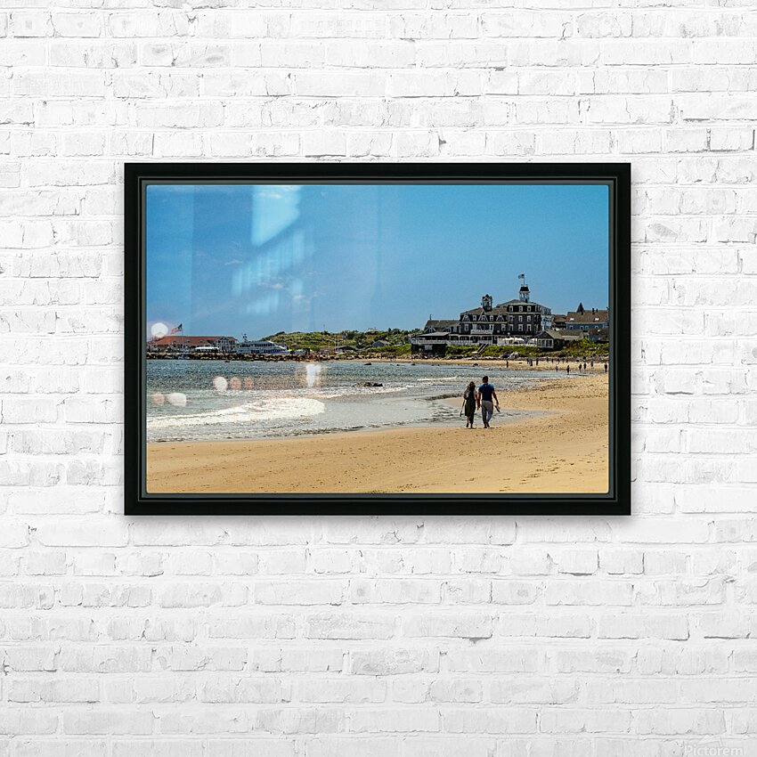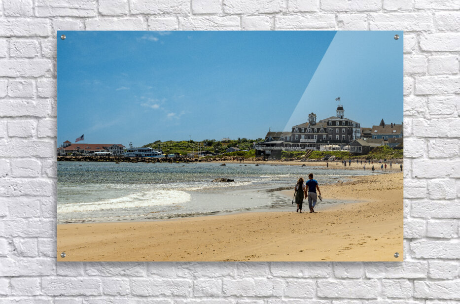 A couple takes a leisurely walk on a beach on Block Island, Rhode Island, while the ferry waits to take passengers back to the Mainland.